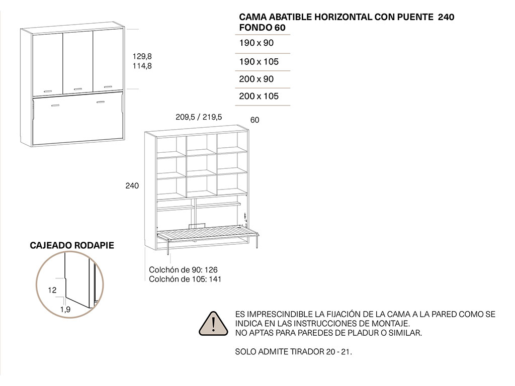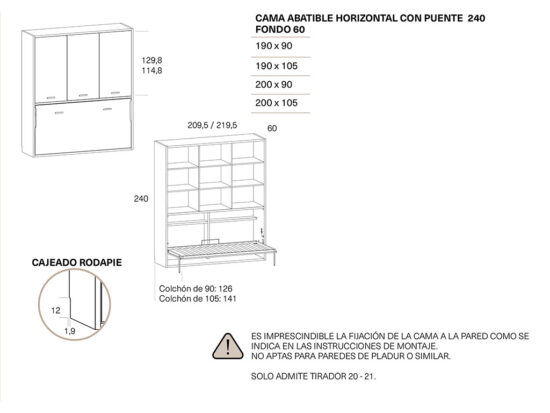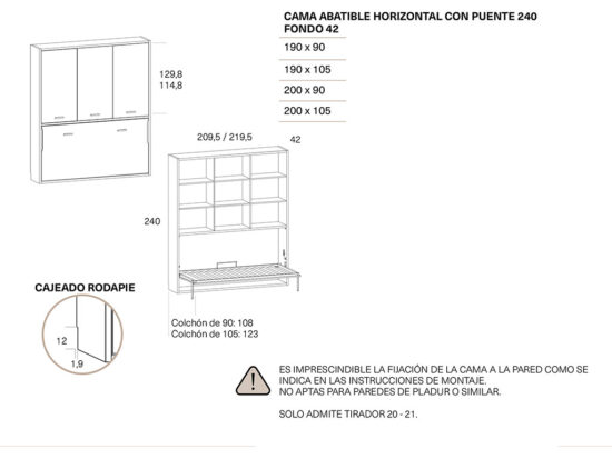 ES IMPRESCINDIBLE FIJAR LA CAMA ABATIBLE EN UNA PARED DE LADRILLO, NO APTAS PARA PAREDES DE PLADUR U OTRO MATERIAL .