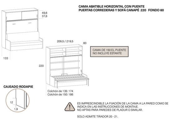 ES IMPRESCINDIBLE FIJAR LA CAMA ABATIBLE EN UNA PARED DE LADRILLO, NO APTAS PARA PAREDES DE PLADUR U OTRO MATERIAL .