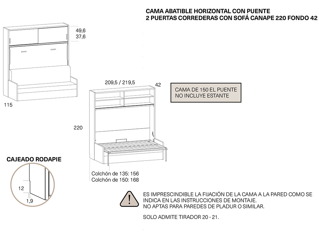 ES IMPRESCINDIBLE FIJAR LA CAMA ABATIBLE EN UNA PARED DE LADRILLO, NO APTAS PARA PAREDES DE PLADUR U OTRO MATERIAL .