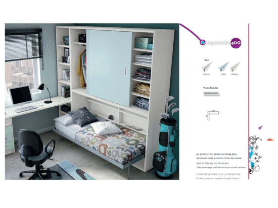 Este sistema abatible nos permite aprovechar nuestra habitación cuando la cama esta plegada y tener un espacio para estudio, juegos…..
