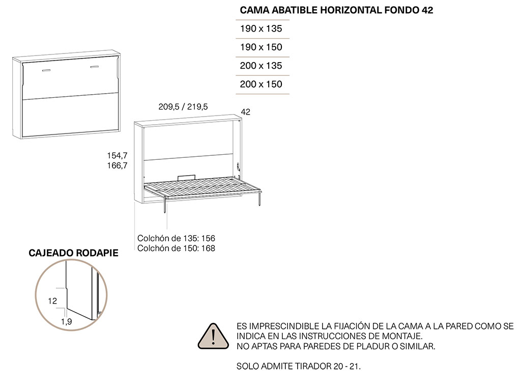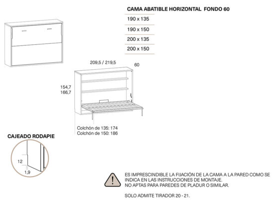 ES IMPRESCINDIBLE FIJAR LA CAMA ABATIBLE EN UNA PARED DE LADRILLO, NO APTAS PARA PAREDES DE PLADUR U OTRO MATERIAL .