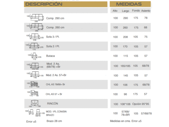 | MEDIDAS | Chaise-longue 2,90 metros, Chaise-longue 2,60 metros, Sofá de 3 plazas 2,08 metros, Sofá de 2 plazas 1,70 metros, 1 Butaca 115 metros. |