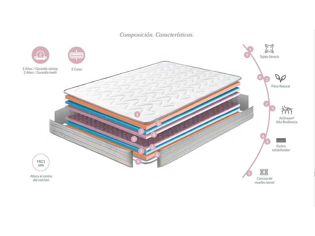 Los muelles presentan una forma de doble cono que se adaptan mejor al peso de las diferentes partes del cuerpo. Es la llamada carcasa tipo Bonell. Permite un soporte óptimo para el descanso y una alta transpirabilidad.