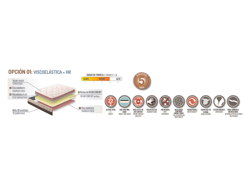 Compuesto por 4 cm de viscolástica con gel y núcleo de hr air confort.