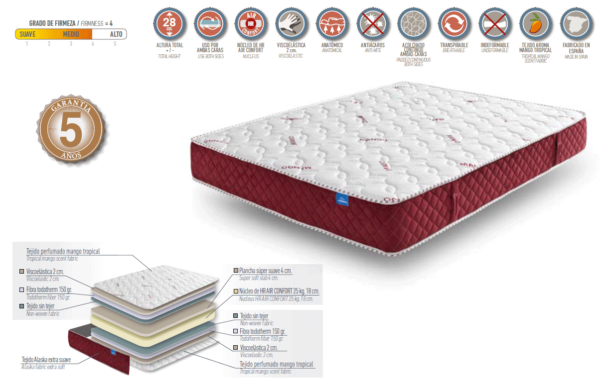 Con el tratamiento arómatico a mango tropical en el tejido exterior este colchón añadirá a tu descanso el relajante placer de la aromaterapia. Todo esto, unido a la perfecta combinación de viscoelástica y núcleo HR, tiene como resultado un colchón que se adapta perfectamente a tus necesidades.