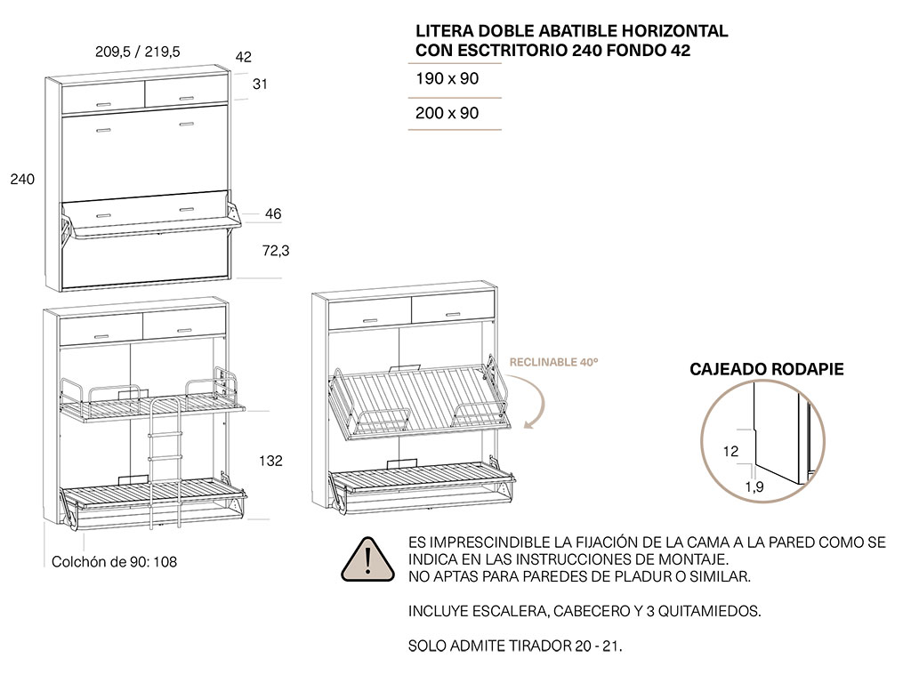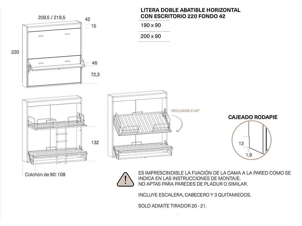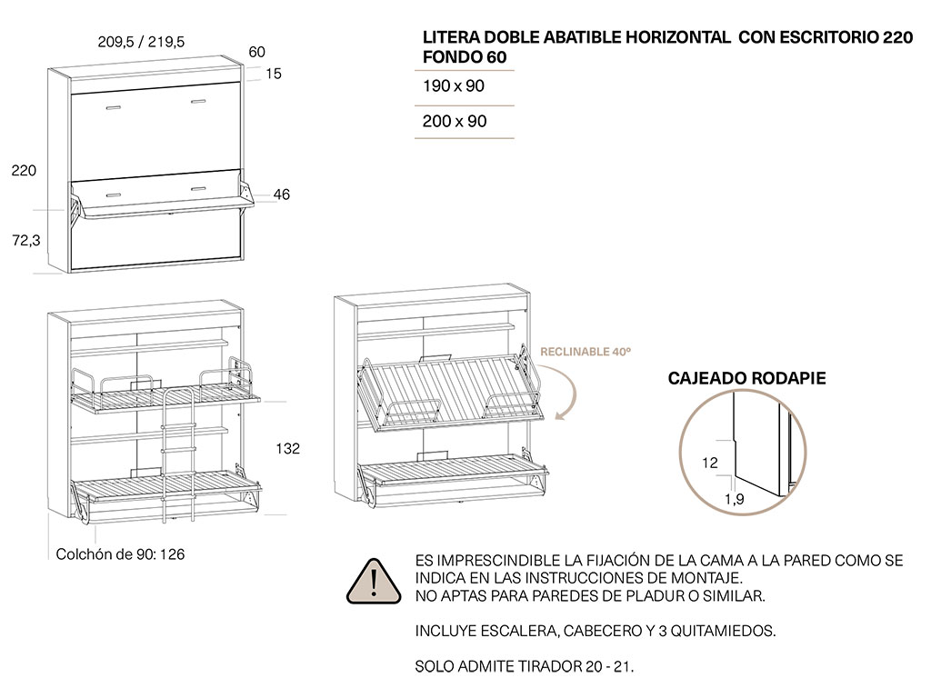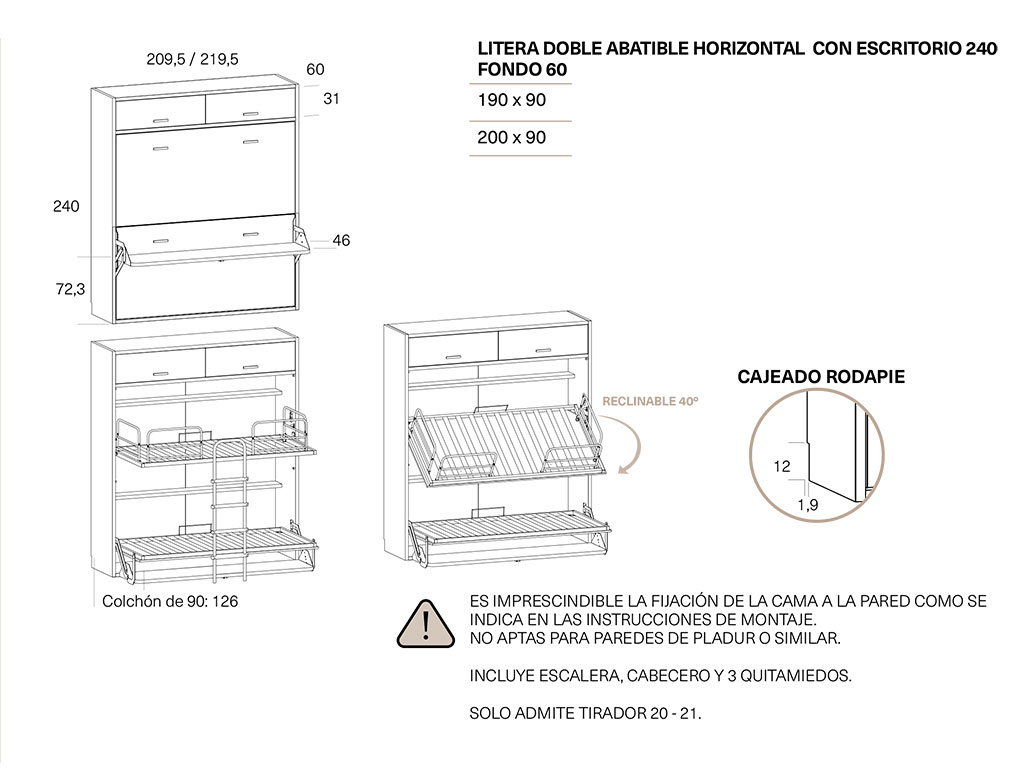 ES IMPRESCINDIBLE FIJAR LA CAMA ABATIBLE EN UNA PARED DE LADRILLO, NO APTAS PARA PAREDES DE PLADUR U OTRO MATERIAL .
