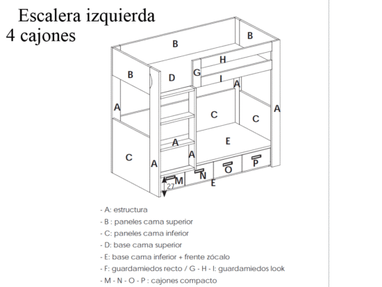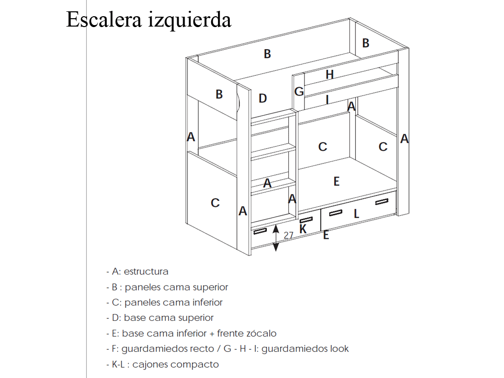 | MEDIDAS | 90X190 con 2 cajones y escalera derecha, 90×190 con 2 cajones escalera izquierda, 90X190 con 4 cajones y escalera derecha, 90×190 con 4 cajones escalera izquierda |