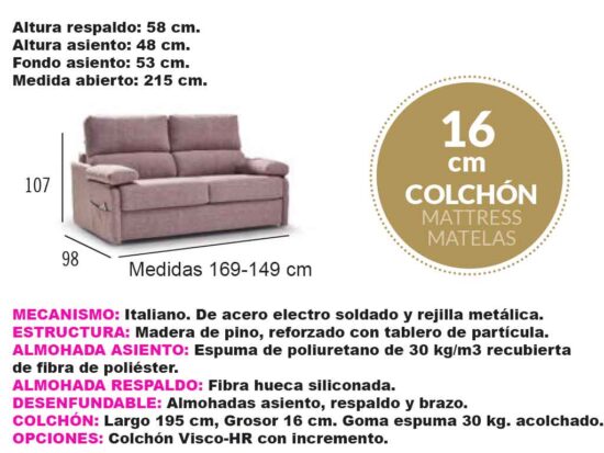 Colchón de grosor de 16 cm y 1,95 metros de largo.