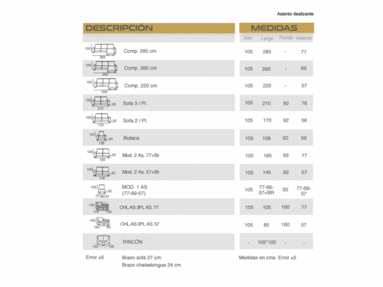 | MEDIDAS | Chaise-longue 2,85 metros, Chaise-longue 2,60 metros, Chaise-longue 2,20 metros, Sofá de 3 plazas 2,10 metros, Sofá de 2 plazas 1,70 metros, 1 Butaca 108 metros. |