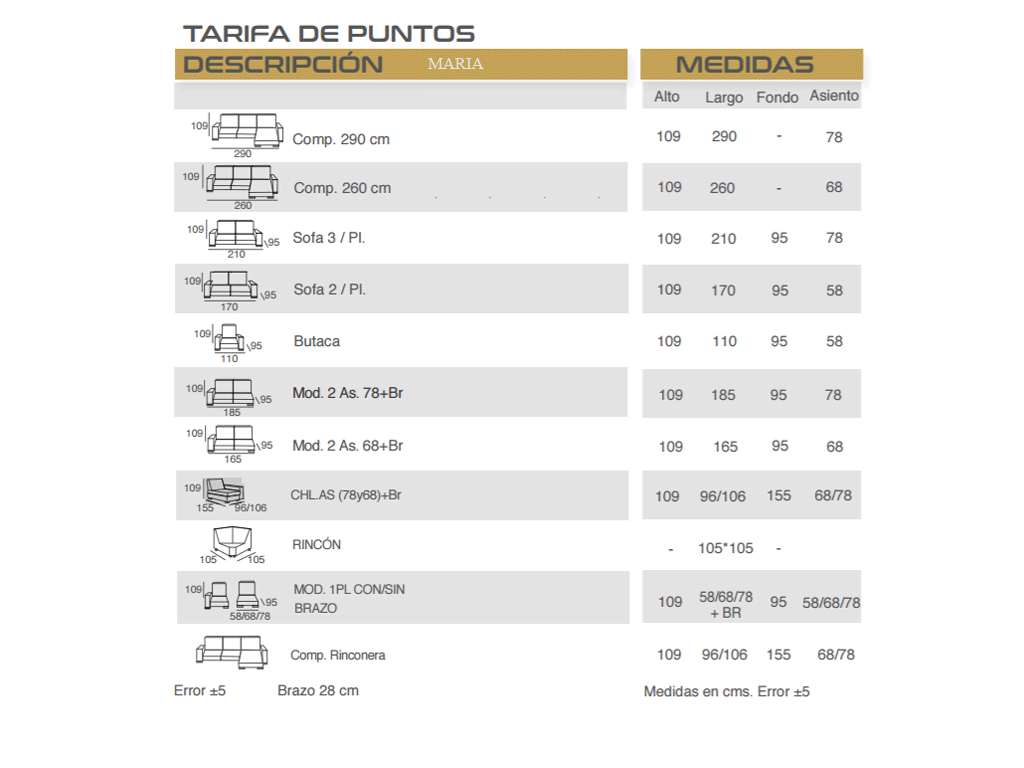 | MEDIDAS | RINCONERA 2,90 x 2,05 Metros, CHAISE-LONGUE 2,90 Metros(sin respaldo en chaise-longue), CHAISE-LONGUE 2,60 Metros (sin respaldos en chaise-longue), SOFÁ 3 PLAZAS 2,10 Metros, SOFÁ 2 PLAZAS 1,70 Metros, SILLÓN 1,10 Metros |